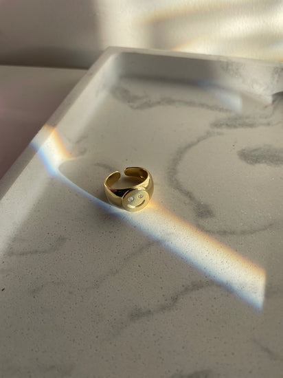 This is your sign to buy yourself that chunky gold and cubic zirconia smiley face ring you have always wanted. She's a fun 90's inspired addition to any fit.