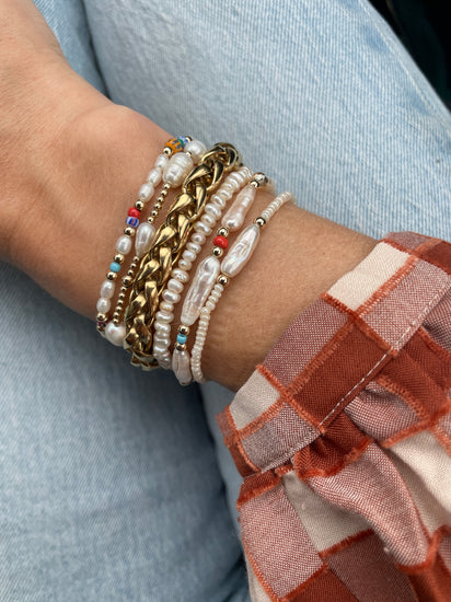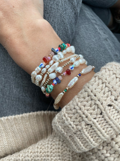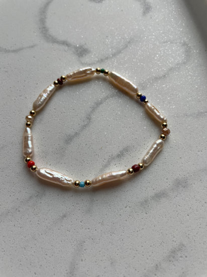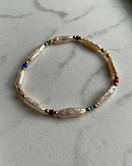 Elegant elongated Biwa pearls, gold filled beads and upcycled glass seed beads on durable elastic stretch cord. Designed and handmade in Toronto.