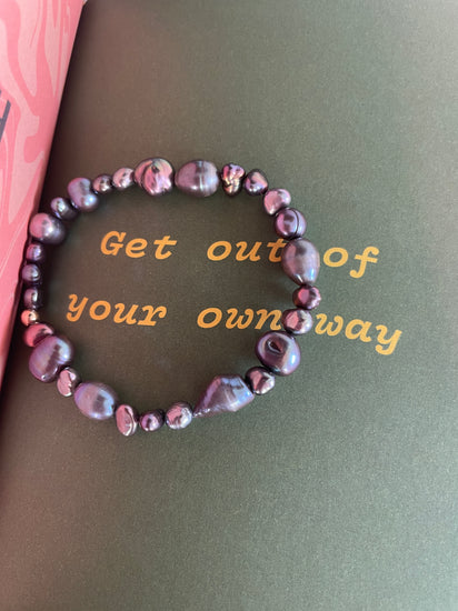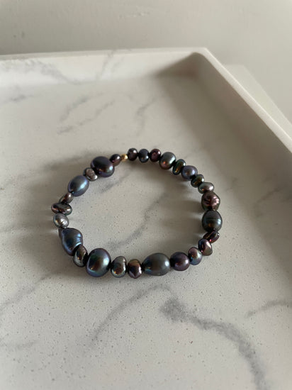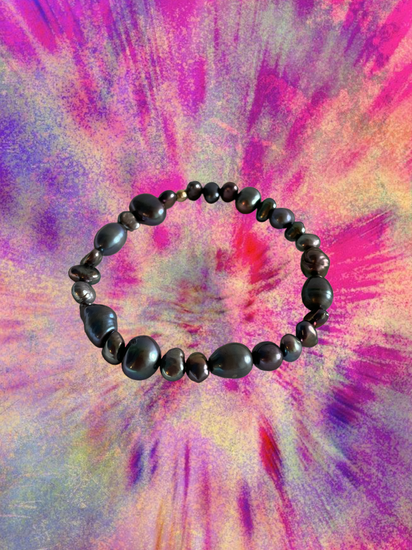 Hand crafted with 100% sustainably sourced up-cycled genuine freshwater black pearls on hearty elastic stretch cord.