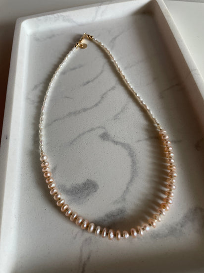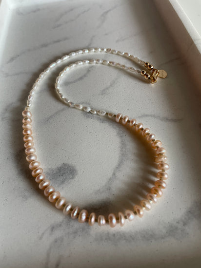 A mix of new and reclaimed pearls, glass beads, 18K gold filled beads and 18K gold plated clasp.