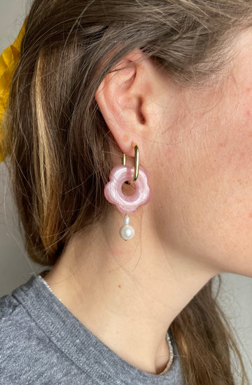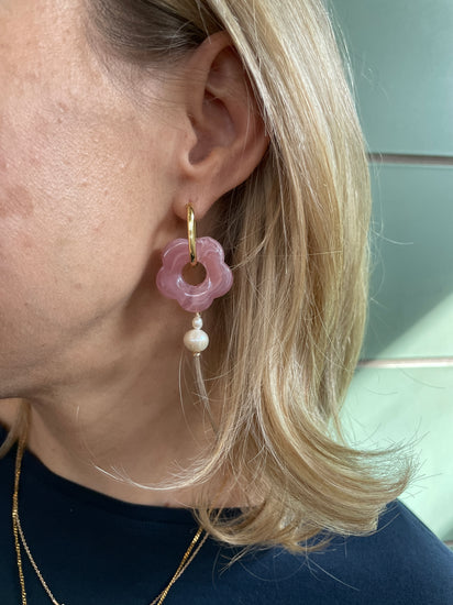 Reclaimed freshwater pearls, acrylic flowers, 18K gold dipped gold elongated hoops.