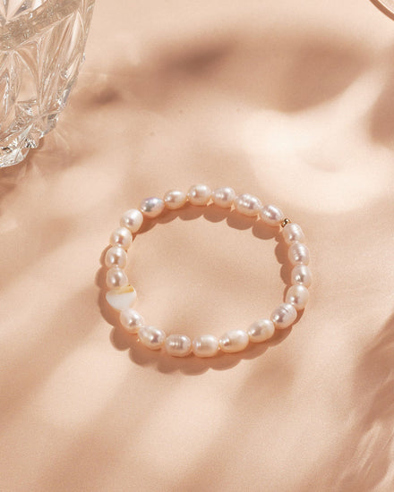 We love a simple modern take on a classic design. The single mother of pearl heart bead gives this otherwise classic stacker a cute trend forward edge.