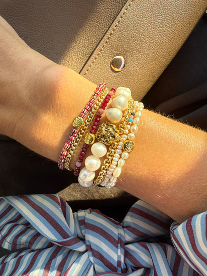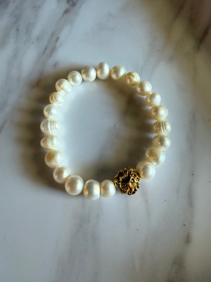 100% reclaimed pearls and gold lion on durable and oh so comfortable elastic stretch cord.