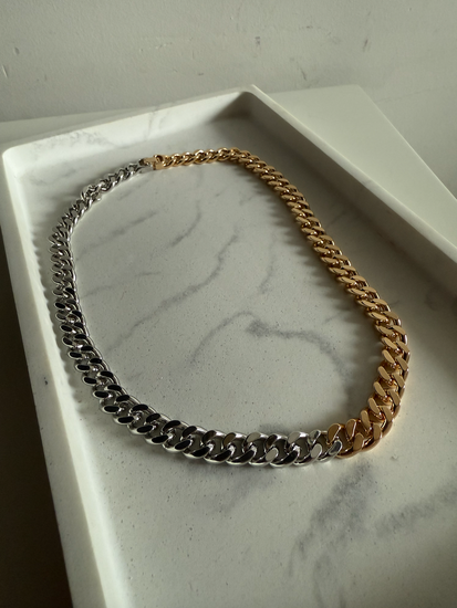 This modern sleek on trend gold and silver tone stunner elevates any outfit. From the boardroom to the farmer's market. You can't go wrong. Looks amazing paired with a simple tee or a blazer. It looks amazing layered up or all by itself.