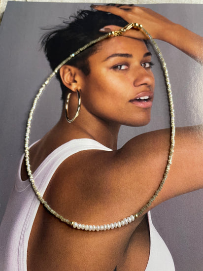 Lovely simple mix of silvery grey Japanese glass seed beads and reclaimed pearls with a 24K gold dipped clasp.