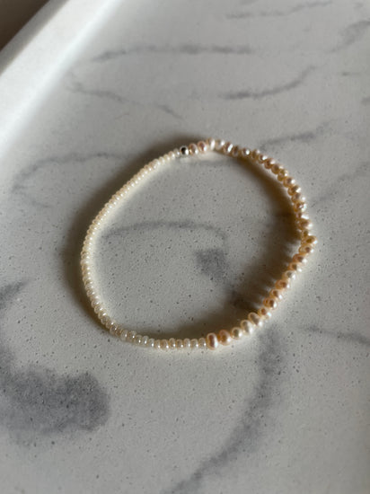 Materials: freshwater pearls, reclaimed glass beads, gold filled crimp bead.