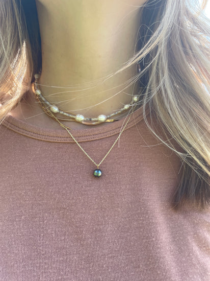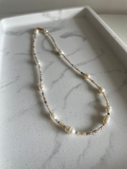 Made from a lovely neutral mix of sand coloured glass seed beads and upcycled pearls with a 24K gold dipped clasp. 16" in length with a 2" chain extender.