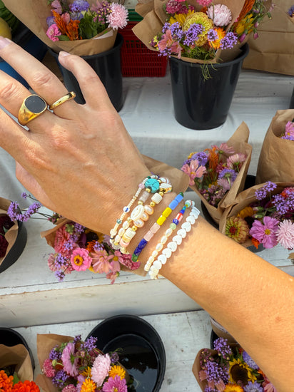 Forget the rulebook. Our Piazza Tennis Bracelet reinterprets a classic icon through a lens of joy and sustainability. We've reimagined the traditional diamond line with a dynamic mix of reclaimed freshwater pearls and luminous glass beads, creating a piece that's rich with history and playful charm.
