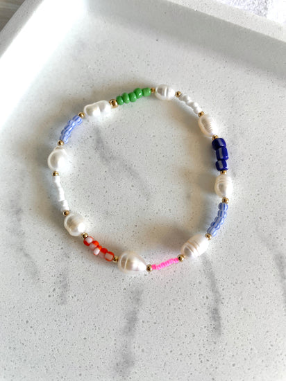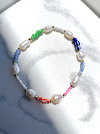 This gorg stretch stacker has all the bright summer vibes. Upcycled freshwater pearls, seed beads, and gold filled spacers. Go ahead - jump in the lake while wearing this summery piece!