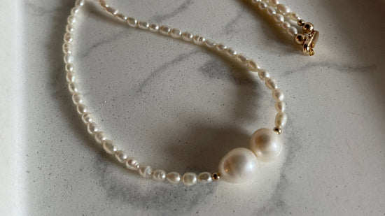 Materials: 100% reclaimed genuine freshwater pearls, 18K gold filled beads, 18K gold plated clasp.